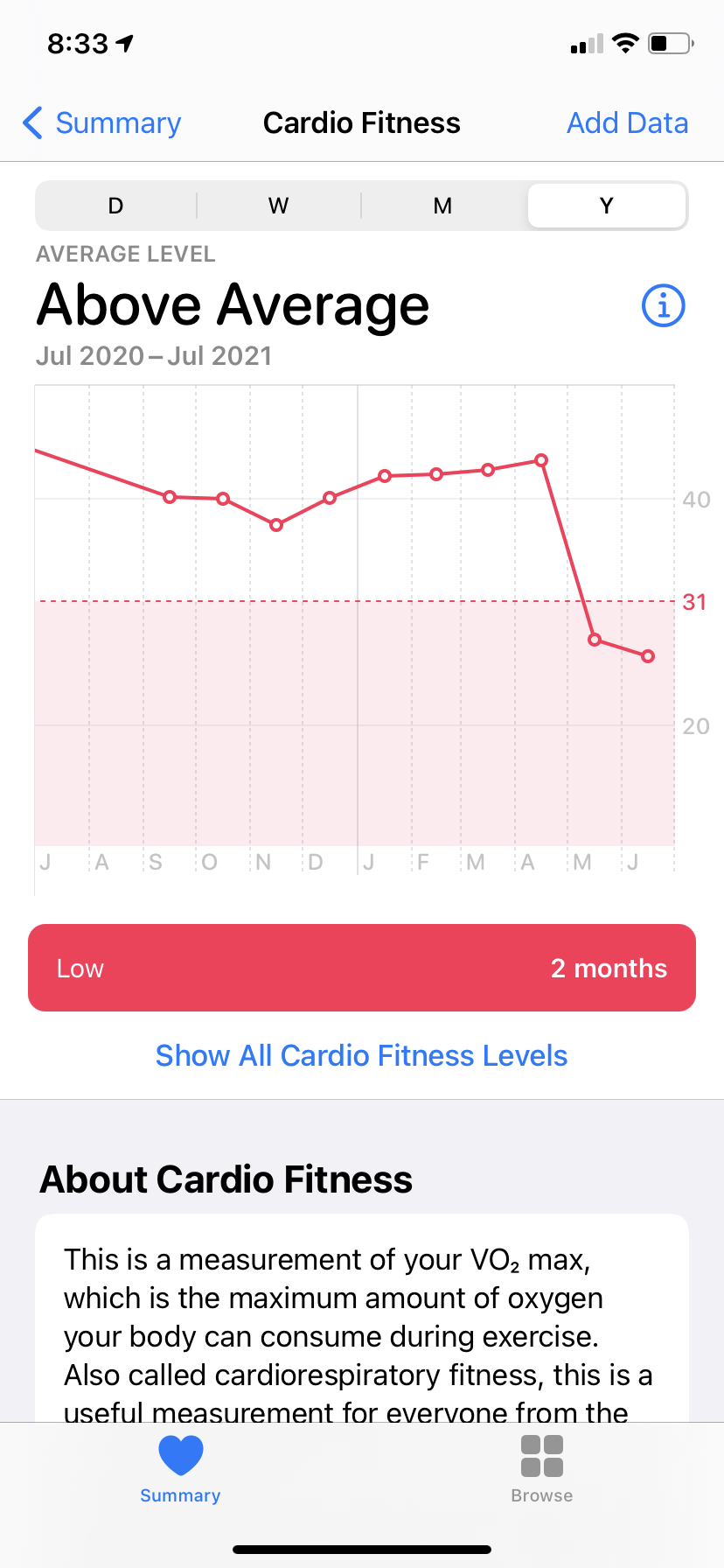 Haha :) Mine is slowly getting back to the level it was before this happened… will still say I’m below average for at least two more sessions… the update to iOS 14.6 and watchOS 7.5 went smooth! Let’s hope it stays like this for a while! Still having problems with getting a move goal suggestion on Mondays though, disabled the Sleep schedule after reading some reports saying that it will fix it.. anyone else experiencing that bug?