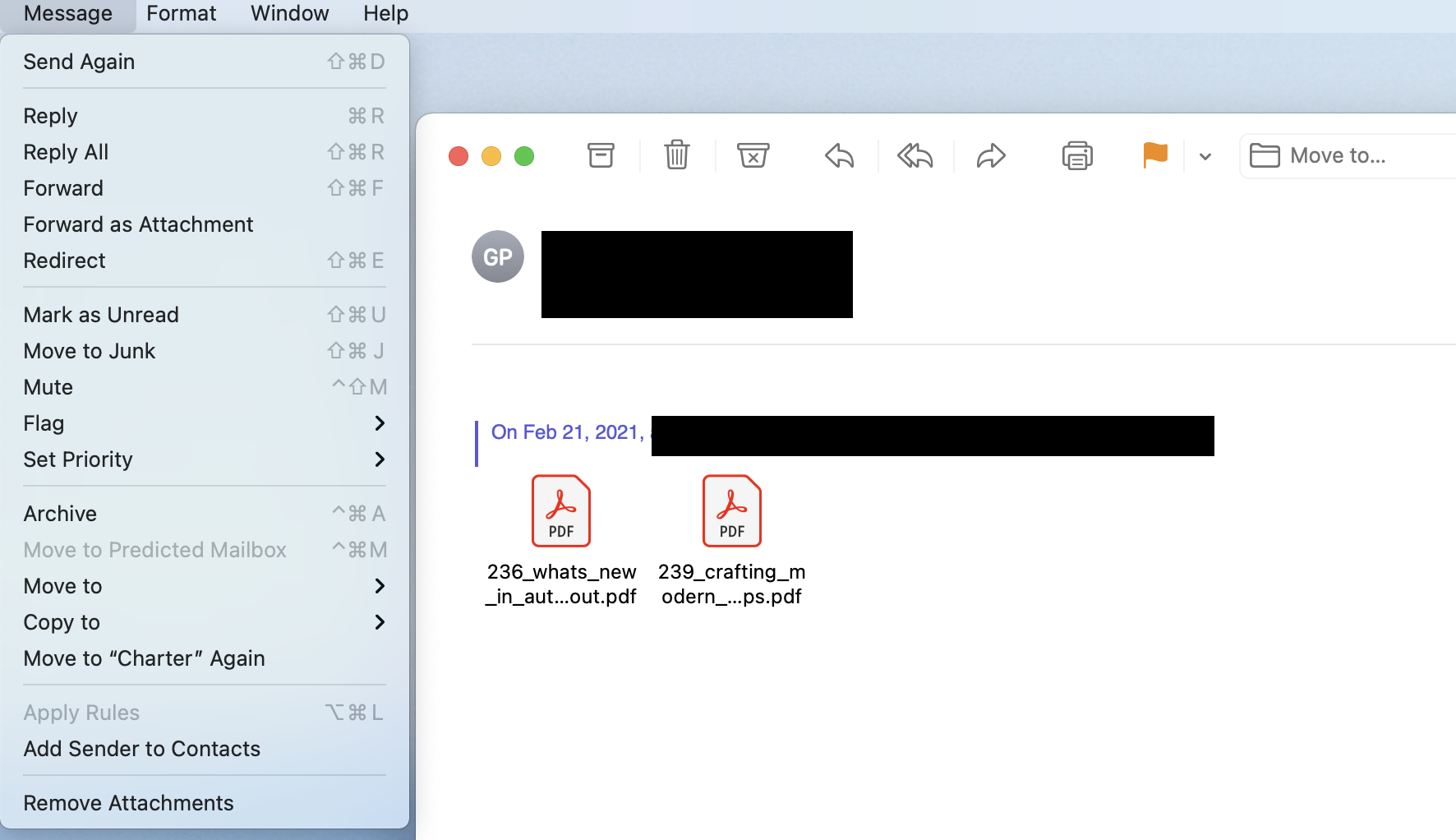 As you see, on the right is the message I've selected. You can tell it's selected because it has the blue frame round it. It has two attachments.