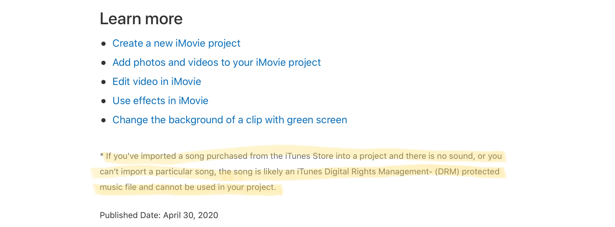 DRM-protected audio content can’t be used or embedded or otherwise copied into iMovie, per Apple: