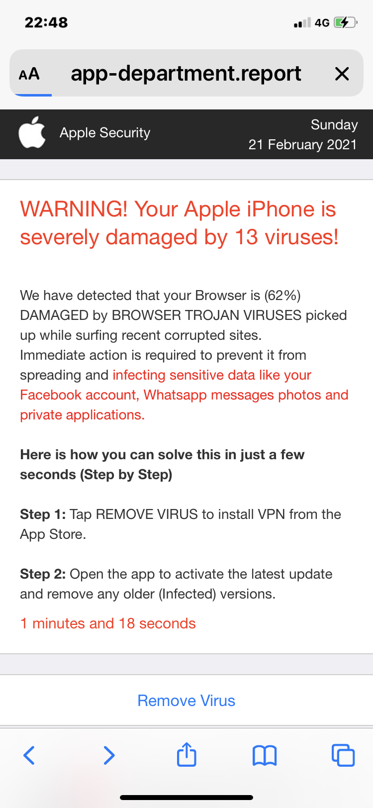 Not sure if this is the right way to get help but yesterday evening got mssg in my iPhone settings that my iPhone is severely damaged by 13 viruses!What to do ?