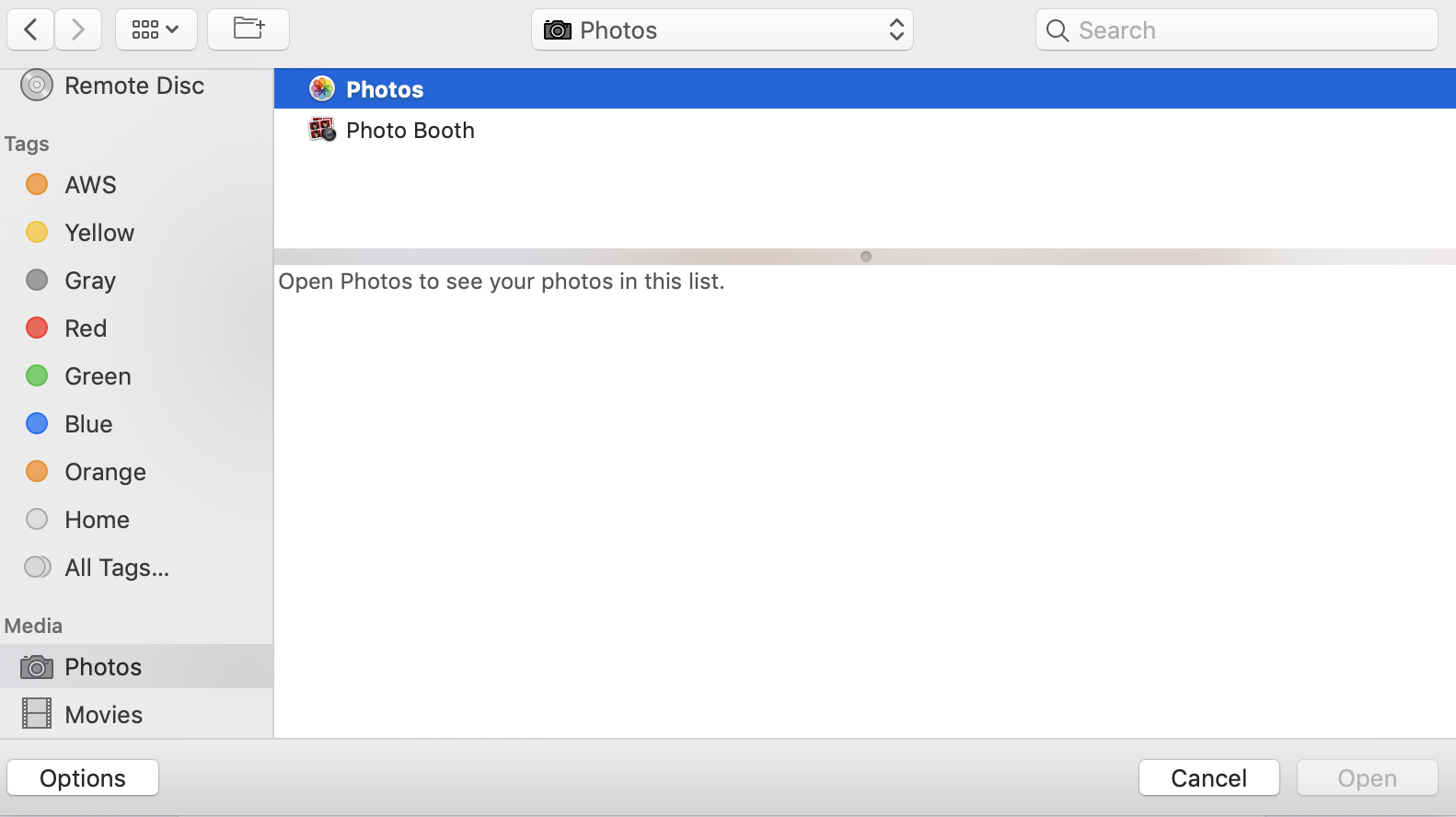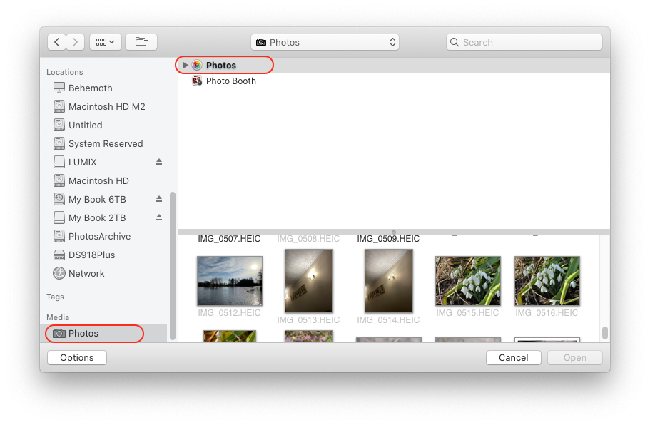 Hello, I have Mojave 10.14.6 and whether using Safari or Chrome with LinkedIn, Facebook, or Twitter I cannot get access to my Photos Library to post an image? I navigate from any mentioned website to the Finder sidebar > Media > Photos, then select my Photos library and it does not open? In the dialog box, it says select photos from your list but there are none as the Library does not open?