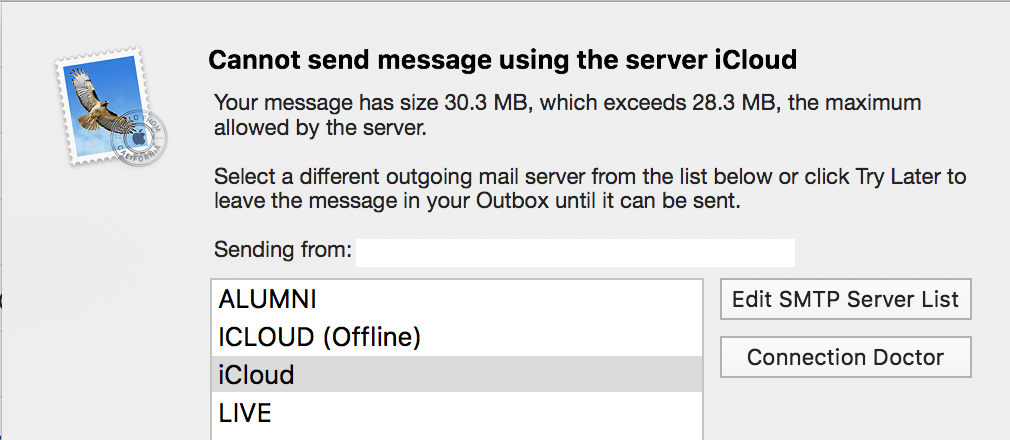 Select a different outgoing mail server from the list below or click Try Later to leave the message in your Outbox until it can be sent."
