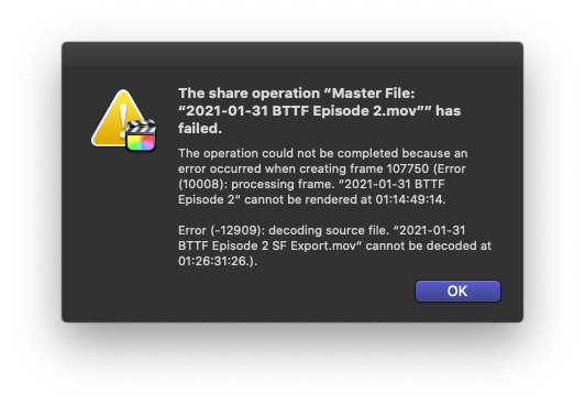 Now that I'm sharing, partway through the share, I get "The share operation has failed: The operation could not be completed because an error occurred when creating frame xyz (Error 10008)" and then it goes on to give me timecode.