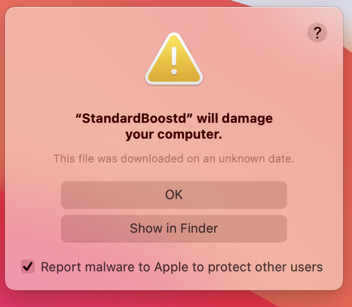 Hello. This warning keeps appearing on my laptop screen. I have followed various instructions to remove StandardBoost. This warning will not go away though! I hit OK but the message appears again after another 10 seconds. If I hit Show in finder nothing happens. How can I force the message to go away? I am using macOS Big Sur 11.2.1. Many thanks for any advice.