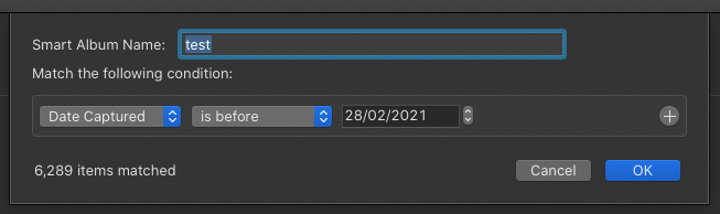 I would like to make a smart album based on the capture date of my photos being older than a certain date. However, date is not an option for the selection criteria!