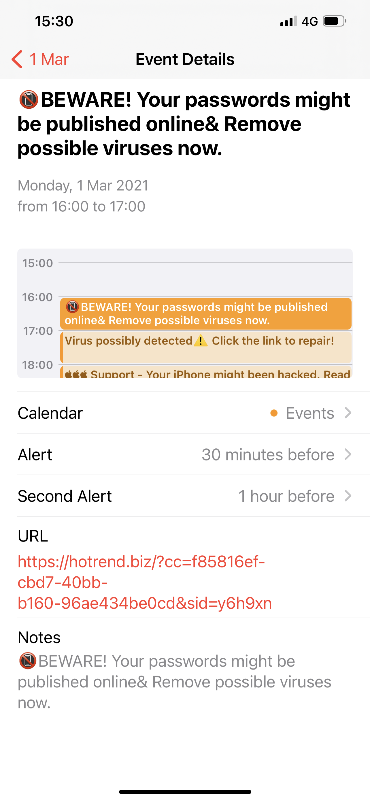 Hi, I recently bought the new iPhone 12 Mac Pro since setting it up I constantly keep getting notifications from my calendar that my phone is being hacked and to tap on the URL. I am quite reluctant to act on this as I would doubt apple would inform me of a hack through my Callander does anyone know how to stop this from happening permanently please