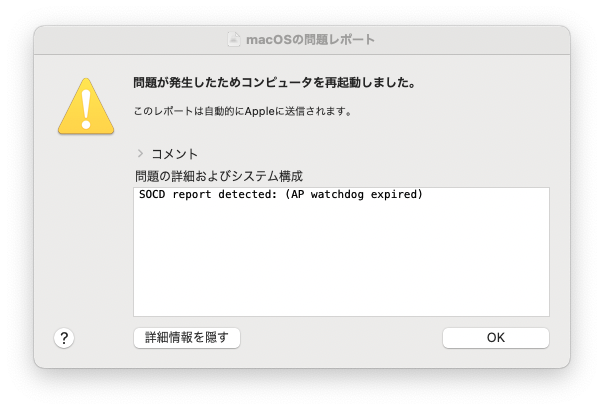 What is SOCD report detected: (AP watchdog expired)? I have only had my Mac Mini a few days, and it has the latest Big Sur updates.