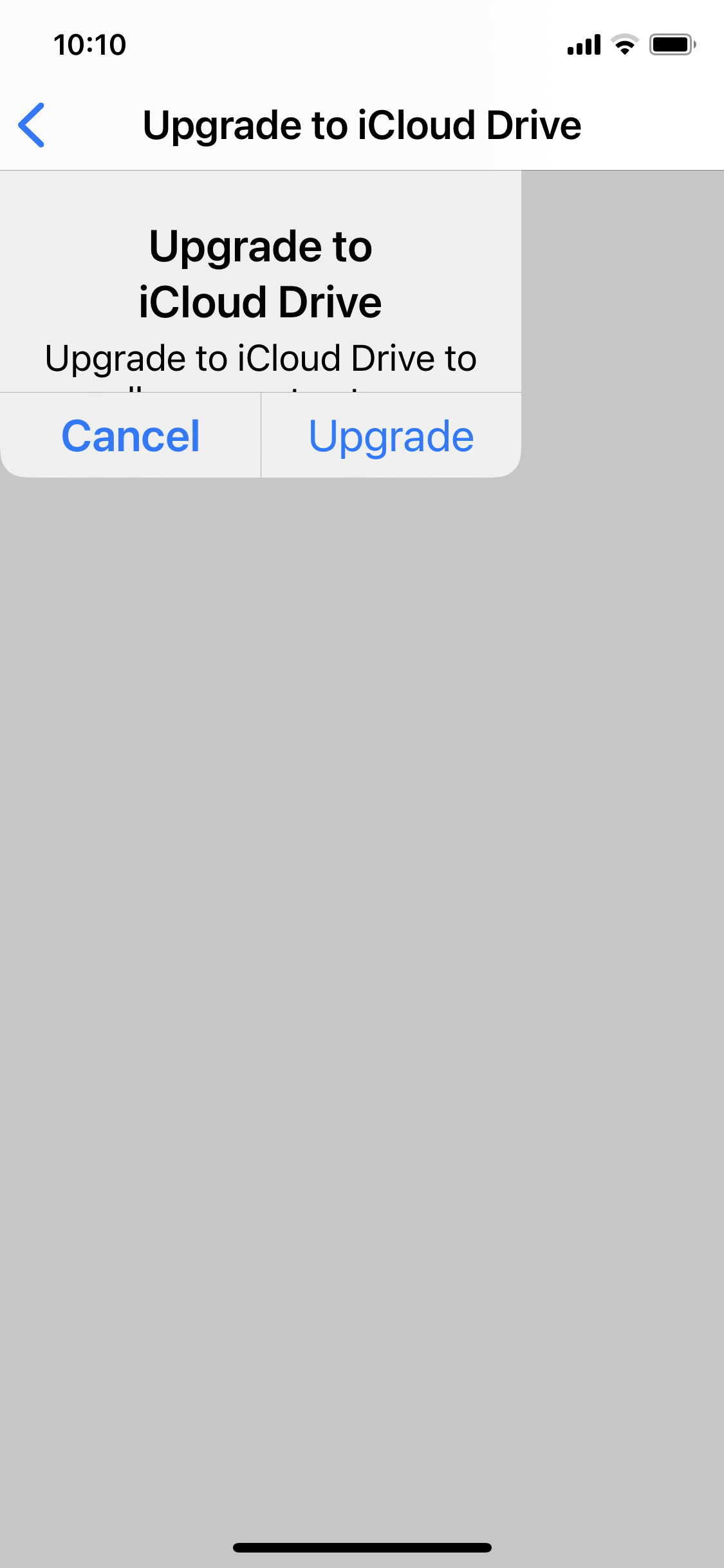 when i try to enable iCloud drive the message displays “upgrade to iCloud drive” and when press upgrade nothing happens kindly help me to resolve this issue.