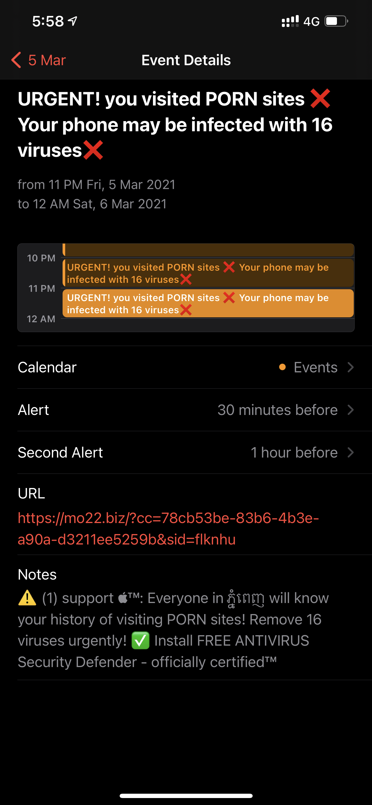 My phone has been hacked from another people in calendar. They show me in calendar like the pictures I send to you. What can I do for this problem ?