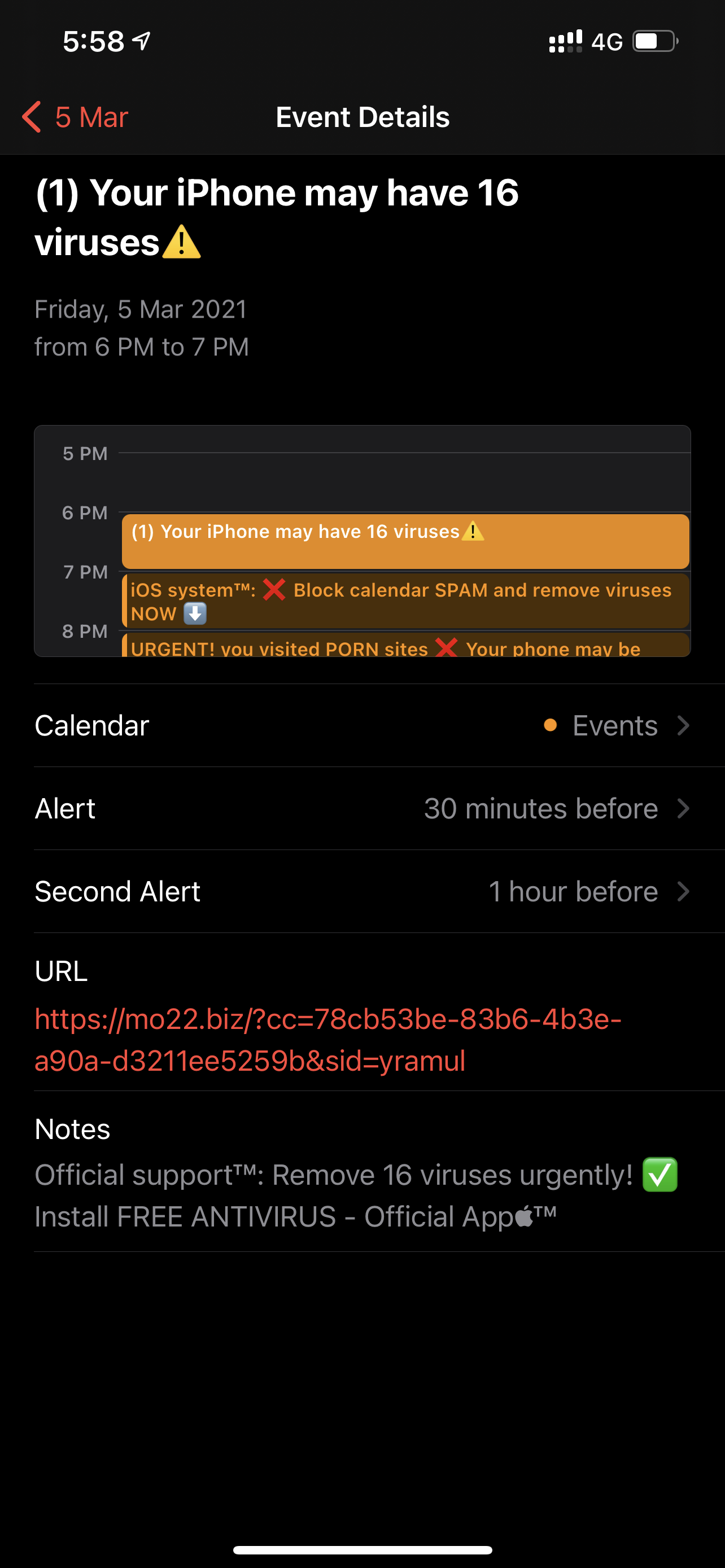 My phone has been hacked from another people in calendar. They show me in calendar like the pictures I send to you. What can I do for this problem ?