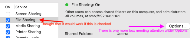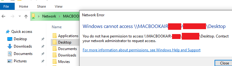 I seem to have user + password problem when I try accessing Mac files from Windows 10 computer. When the pop window shows up to ask for user name and password. I type in everything the same as how I log on to my Mac with the same user name and password. However, it never can connect to Mac