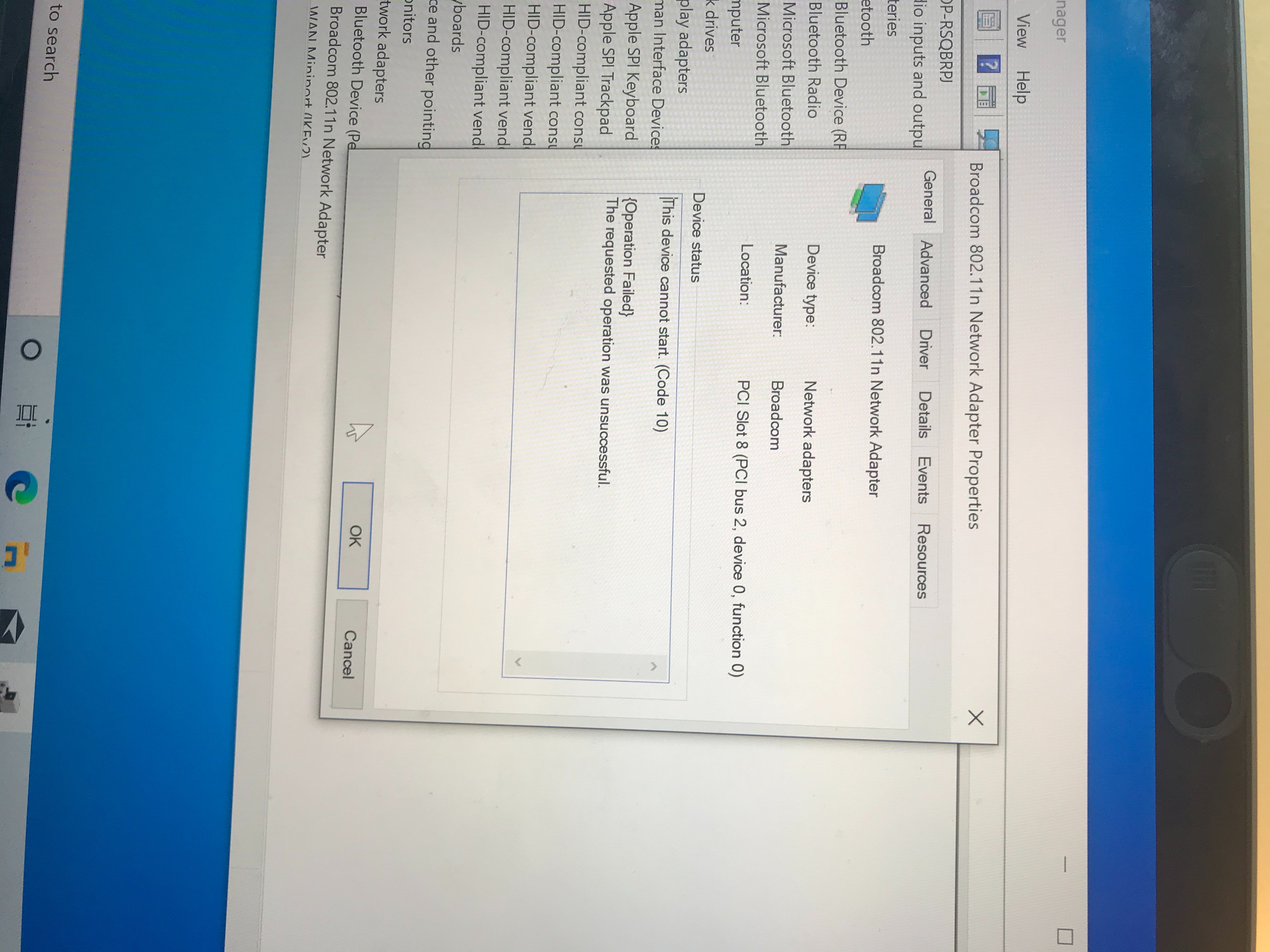 I know there's a lot of posts about this, and even following the steps in there I can't seem to fix it. I just used bootcamp to get Windows 10 running on my computer. I've tried installing every single Broadcom 802.11 driver I see in Windows under Network Adapter, but none work. About half show up under 'other devices' with a question mark and show as 'no driver installed'. The other half (e.g. the latest 802.11 n) do show up under network adapters but under 'general' the device status says 'this device cannot start (code 10)'. I've pasted below my mac OS info, and info on my wifi from mac OS / about this mac / system report. Yesterday, before installing boot camp, I updated my mac OS to the latest version. I've also pasted a picture below of what it looks like under windows. Note that I know that my wifi information says 802.11ac, when I try to install that driver it doesn't work either.