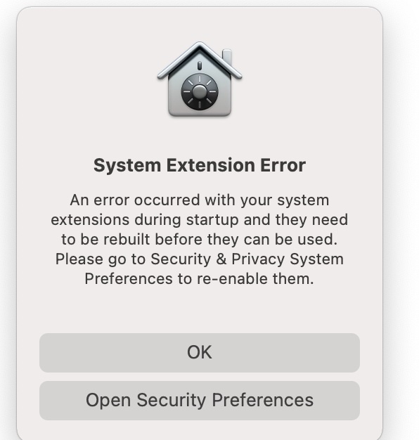 Every time I restart my M1 MacBook Pro I get this error: "An error occurred with your system extensions during startup..." I've been to the Security Preferences and turned off all extensions and then turned them back on but I still get the notice.
