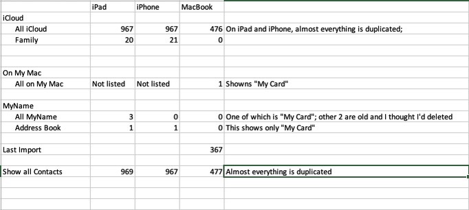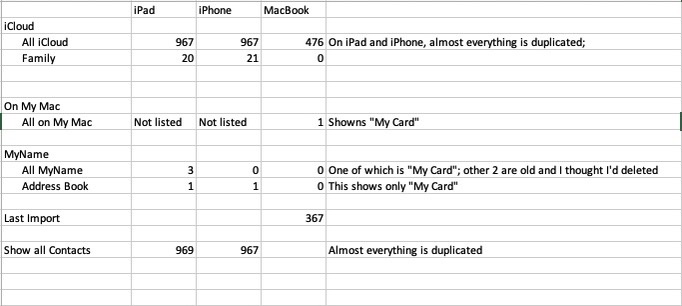 For all 3 devices, under Contacts, it shows 2 mail groups: "iCloud" and "MyName". The Mac also show 2 additional groups: "All on my Mac" and "Last Import". Screenshot below shows number of Contacts in each Group