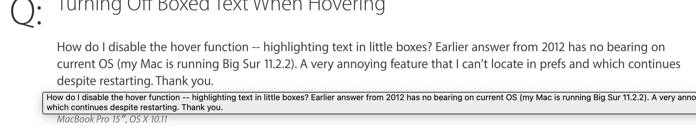How do I disable the hover function -- highlighting text in little boxes? Earlier answer from 2012 has no bearing on current OS (my Mac is running Big Sur 11.2.2). A very annoying feature that I can't locate in prefs and which continues despite restarting. Thank you.