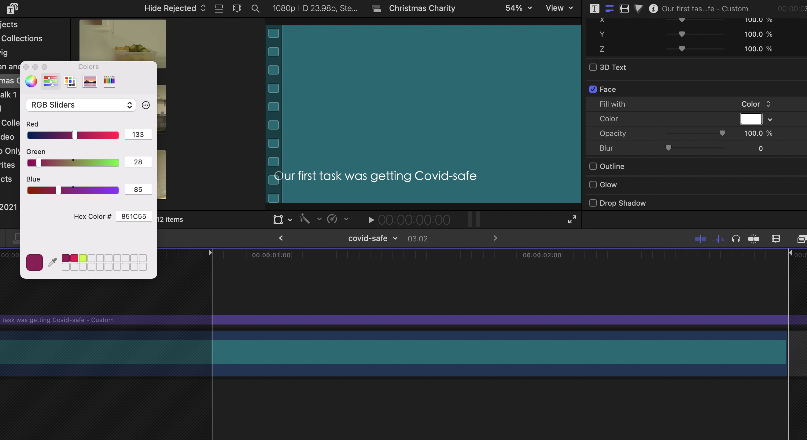 I'm trying to change the colour of the font in fcpx using an rgb code. I'm clicking TEXT, then FACE. Then I'm clicking on the colour box to open the palette. When I have the palette box open I can manually change the RGB, but it won't change the colour of the text on my timeline. When I've watched youtube videos it changes the colour on the timeline automatically but it's not doing that for me, and I can't find a way to "set" the colour that I'm choosing. I'm probably doing something stupid but just can't figure it out.