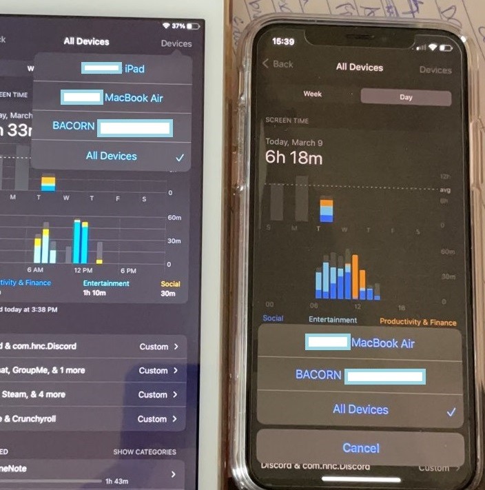 Hope someone can help. I am trying to setup screen time for my daughter and something is not working correctly. She has a iPhone, iPad and MacBook Air. I have setup screen time with downtime, app limits and turned on the "share across devices" option in each device. I am not using the "family share" or family group, it is just setup as an individual with each device using the same apple/iCloud account (my daughter's). The downtime and limits seem to be working on each device but the sharing across devices is screwed up.