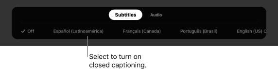 During playback, press the down button on the smart TV or device remote to show the Subtitles pane, then select an option.