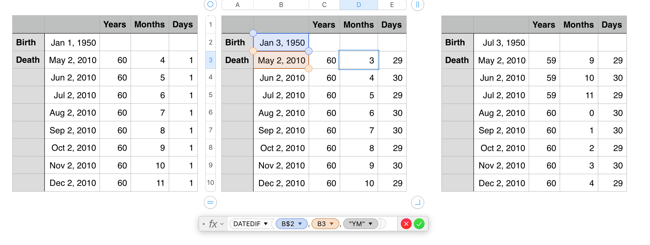 The formula shown below the middle table is the one calculating the number of Months. It differs from the ones in column C (years) and column E (days) only in the third argument. The absolute reference operator ( $ ) in the reference to B2 is there only because I was testing several death dates against the same birth date, and needed the formula to hold that row as it was filled