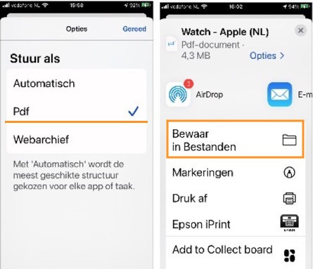 Click on the Share icon. In the subsequent window, click on Options at the top. Select PDF. Then Save to Files.