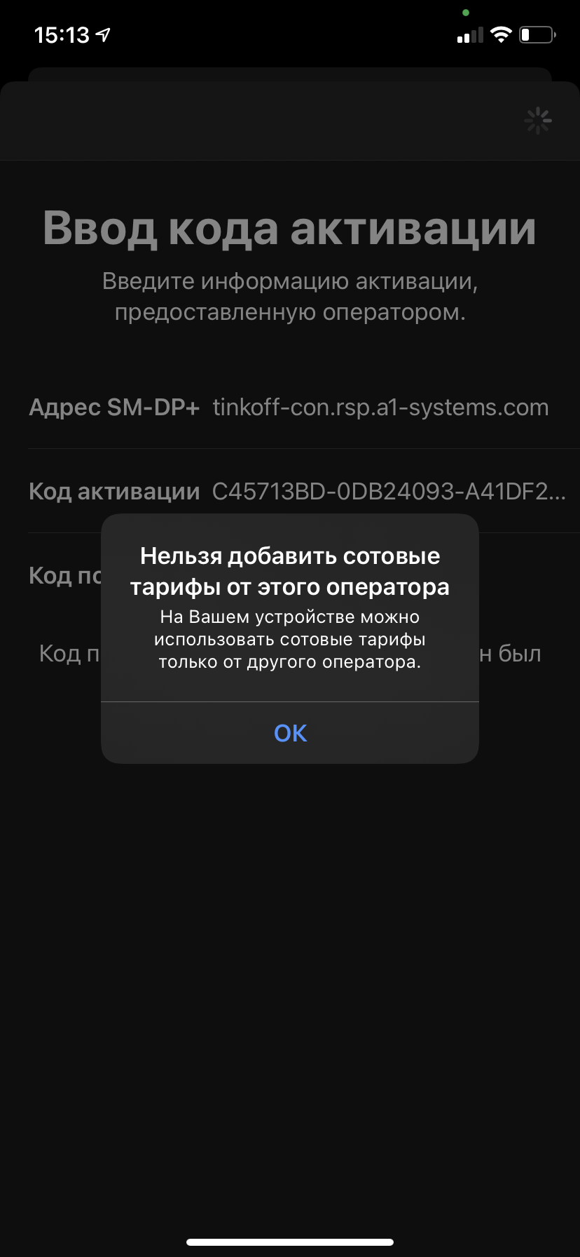 Hello. I can't activate eSim. My iphone displays the inscription - “Can't add cellular rates from this operator. You can use cellular tariffs on your device only from another operator. "