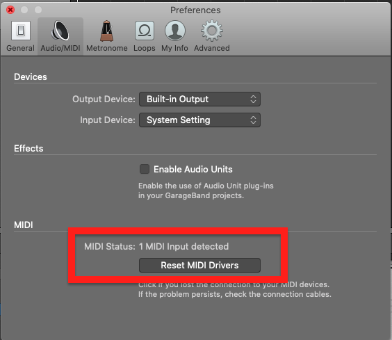 Opened GarageBand, checked the preferences, 1 MIDI input detected.