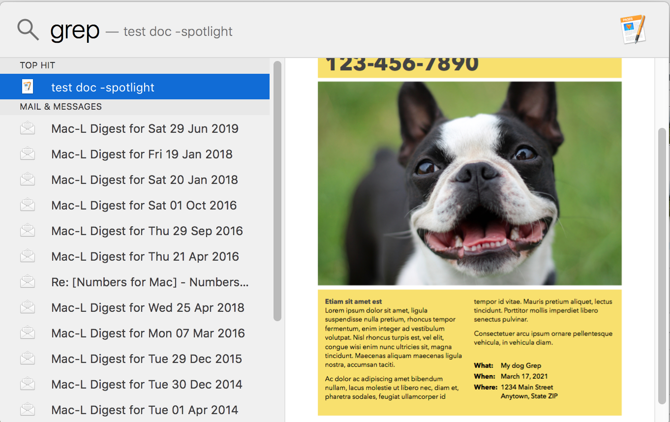 Here's a search result on "grep". Note the name of the Pages document, and the name of the dog, which appears once in the document in the text box below the photo.