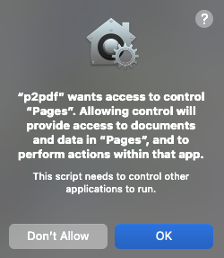 option+Save As… and save as Application to the Desktop (pages2PDF.app). Drag and