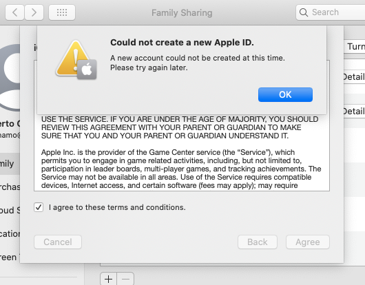 Trying 4 times to create my child's account in my family sharing always returns a message as per the screenshot attached. How do I get rid of it?