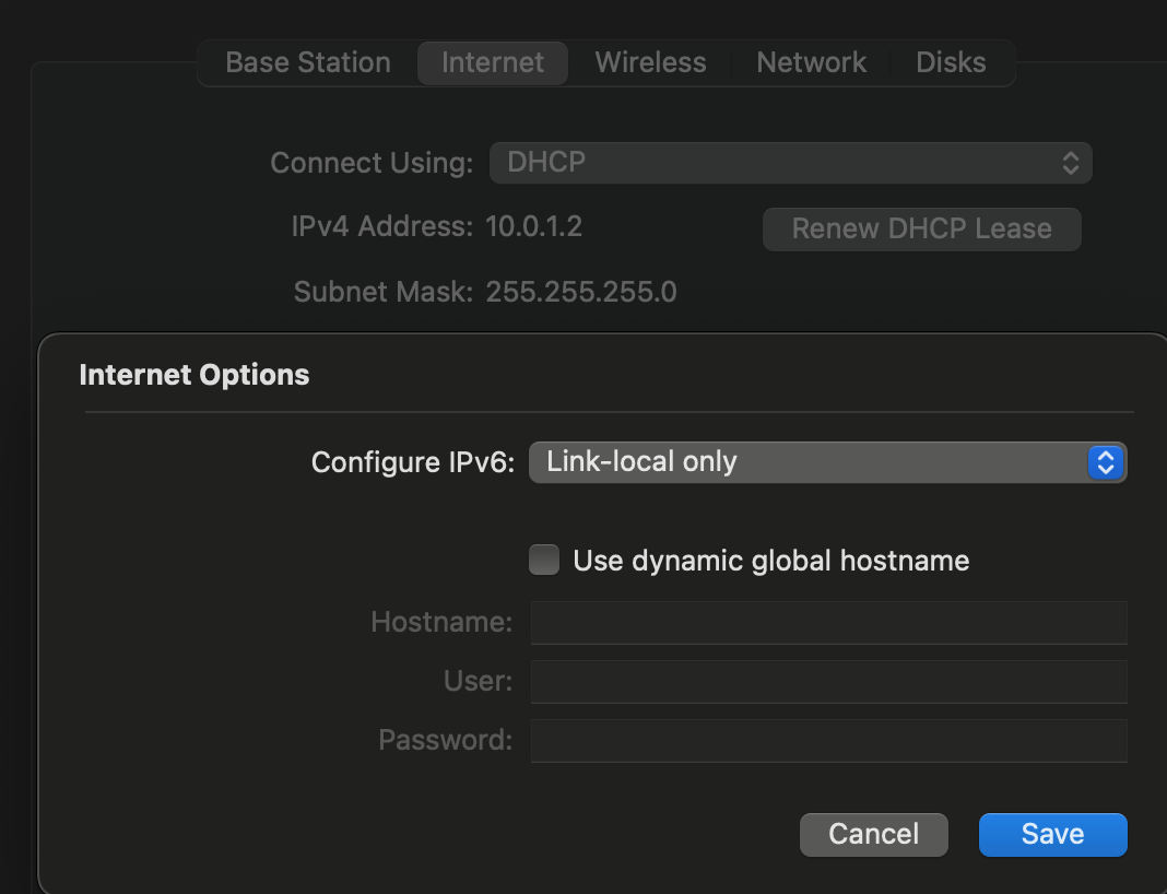 Re IPv6, the AEBS has always had "Block incoming IPv6 connections" checked. I understand that I can ask Ziggo to turn off IPv6 entirely for our account - should I do that? If not, should that checkbox be checked? I've run one of those online IPv6 tests and everything reports green except "Test if your ISP's DNS server uses IPv6 - bad".