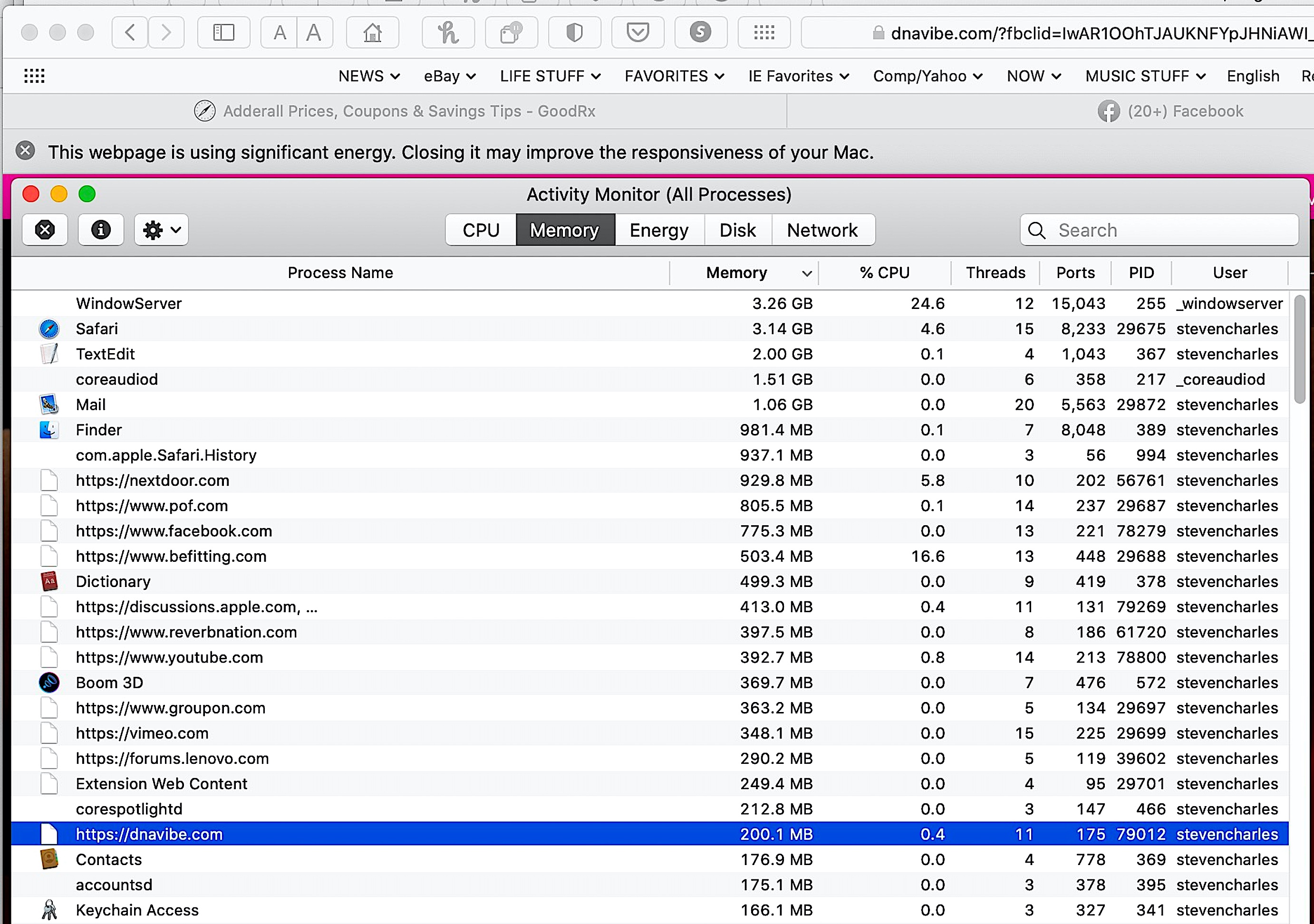 And you can see Safari alone is using over 3GB of memory, and .apple.Safari.History is using almost a whole Gig of RAM, for what? I've cleared cache, but to no effect, and I can't believe just retaining places visited would require that much memory. I thought Safari is supposed to be most efficient for those of us using Macs, that "seamless coordination" due to all from the same source, etc...