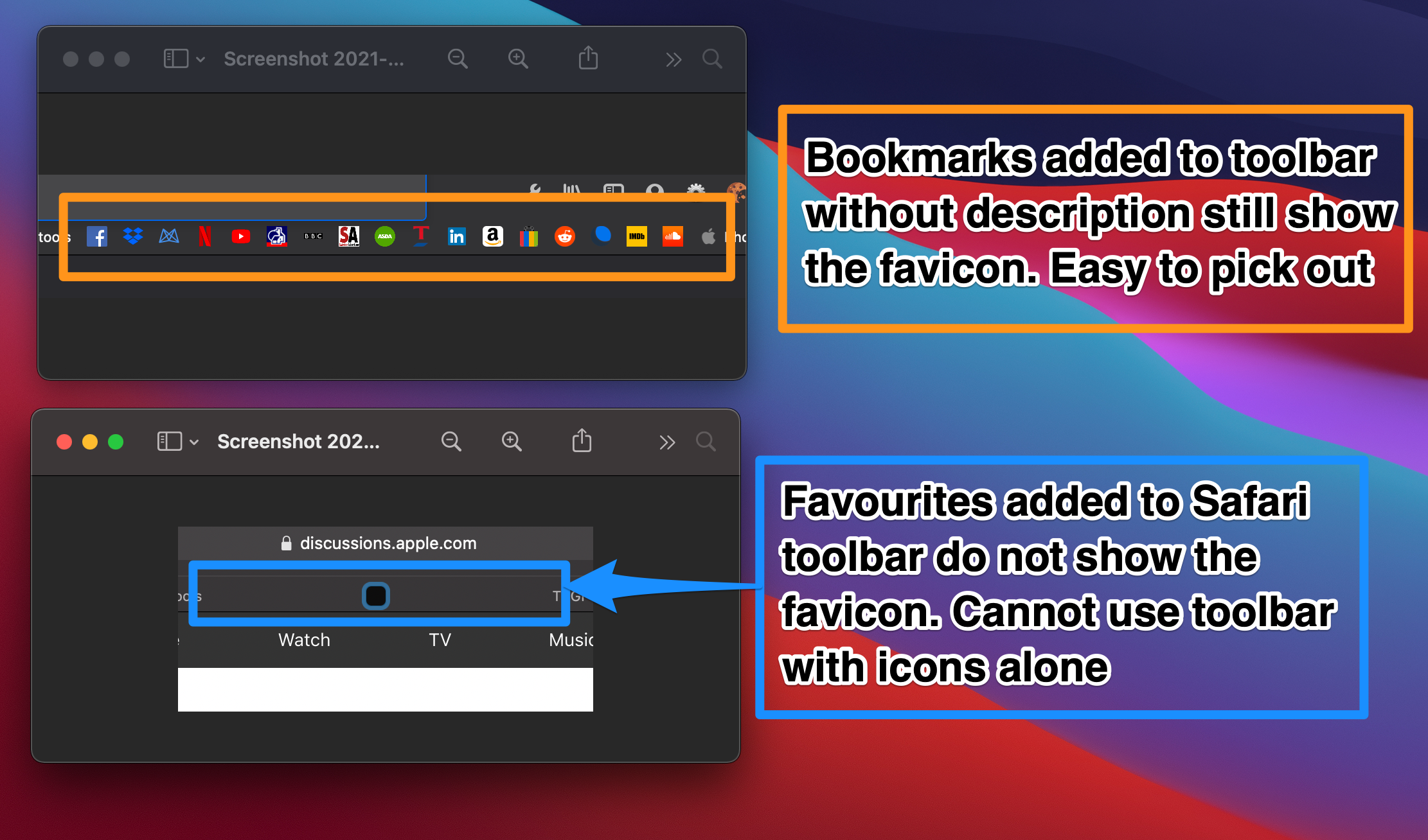 I really want to use Safari as my main browser now that I am using a new M1 MacBook Air, in order to make the best use of battery. I have used both Chrome and Firefox as my main browser. One of the things I REALLY like about those browsers is that I can add favourite/bookmarks to the toolbar with *just* the website's icon (favicon) and quickly pick from that. I imported bookmarks from Firefox to Safari, but the favicons are missing. I did try visiting those sites to pull in the icons (this is the behaviour with Firefox if starting from fresh).