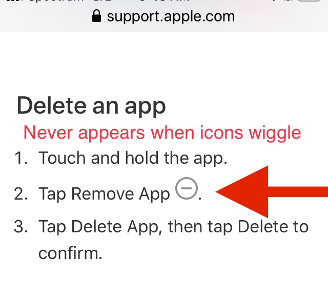 When I hold app and icons wiggle to delete an app, no “x” or “-“ sign appears to delete app