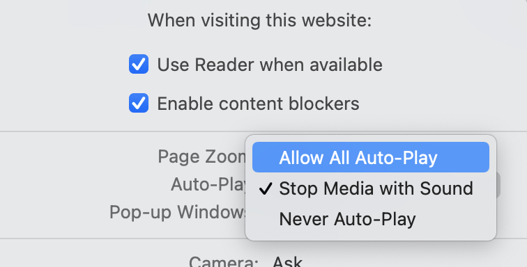 Safari (v 14.0.3, Big Sur) blocks video autoplay at websites until I click the Reader View icon. Then the video starts and I'm unable to stop it. Any suggestions?
