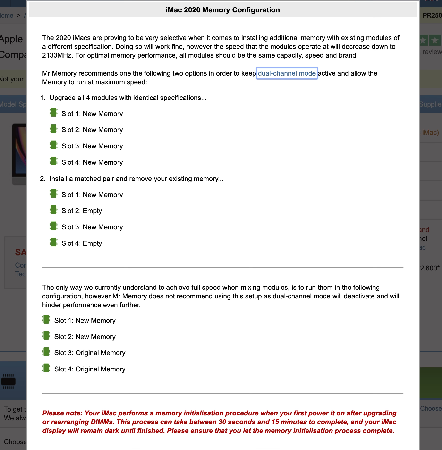 I've installed new 2x16 GB RAM chips in slots 1 & 2 on my 2020 iMac, leaving the original Apple 2x4 GB chips in slots 3 & 4. Everything works fine at 2667 MHz. However, the chip vendor states that dual channel mode is disabled unless you either upgrade all 4 slots with new matching chips or install a new matched pair into slots 1 & 3 and leave slots 2 & 4 empty. I don't know what "dual channel mode" actually is or why it's important, but is it true that installing new RAM chips alongside the Apple ones will hinder the performance of the machine? Thanks for any advice or explanation!
