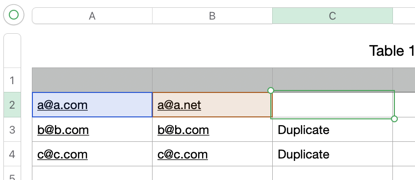 Hi, I've got two columns in Numbers and one is full of thousands of email address, I need to see if I have any duplicates. I've tried the IF(A2)+(A1)="Duplicate"," " function and IF(B2=B1,"DUPL","")