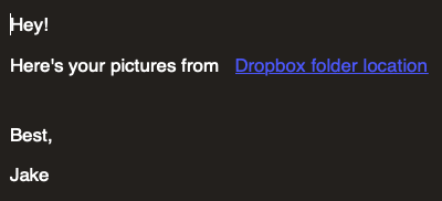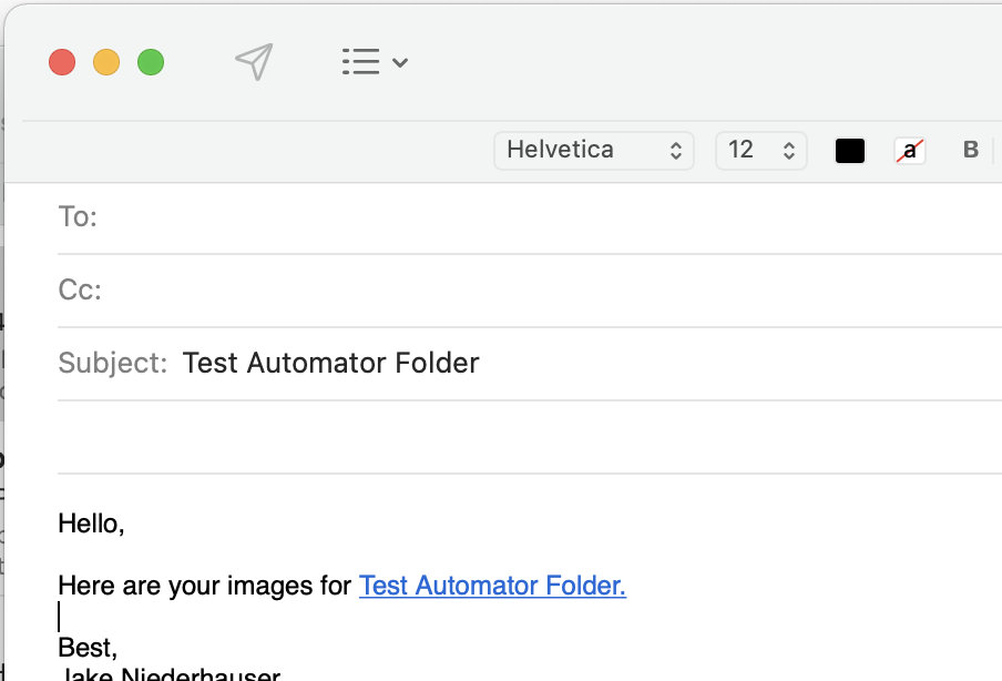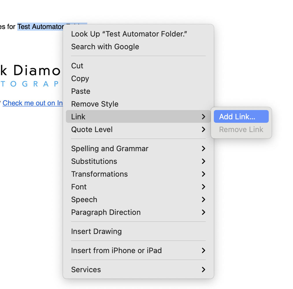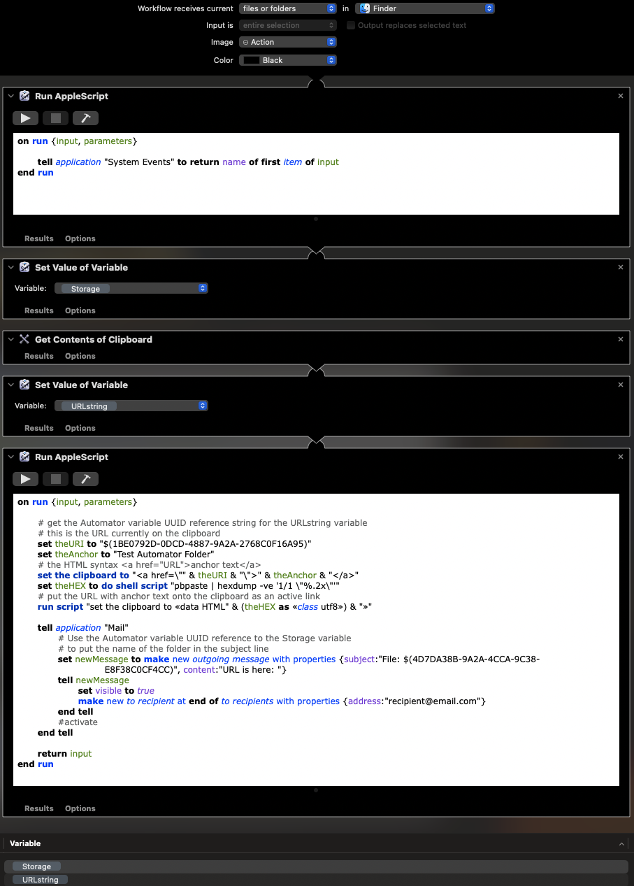 and it would deposit the URL string from the clipboard there as an active link in the sent Mail message. However, you want to use a custom text anchor "Test Automator Folder" as the link name, which adds complication to the solution. What I do is put the entire anchor link with that text on the clipboard, and then present the Mail compose window, where you simply paste from the clipboard behind the text where you want it.