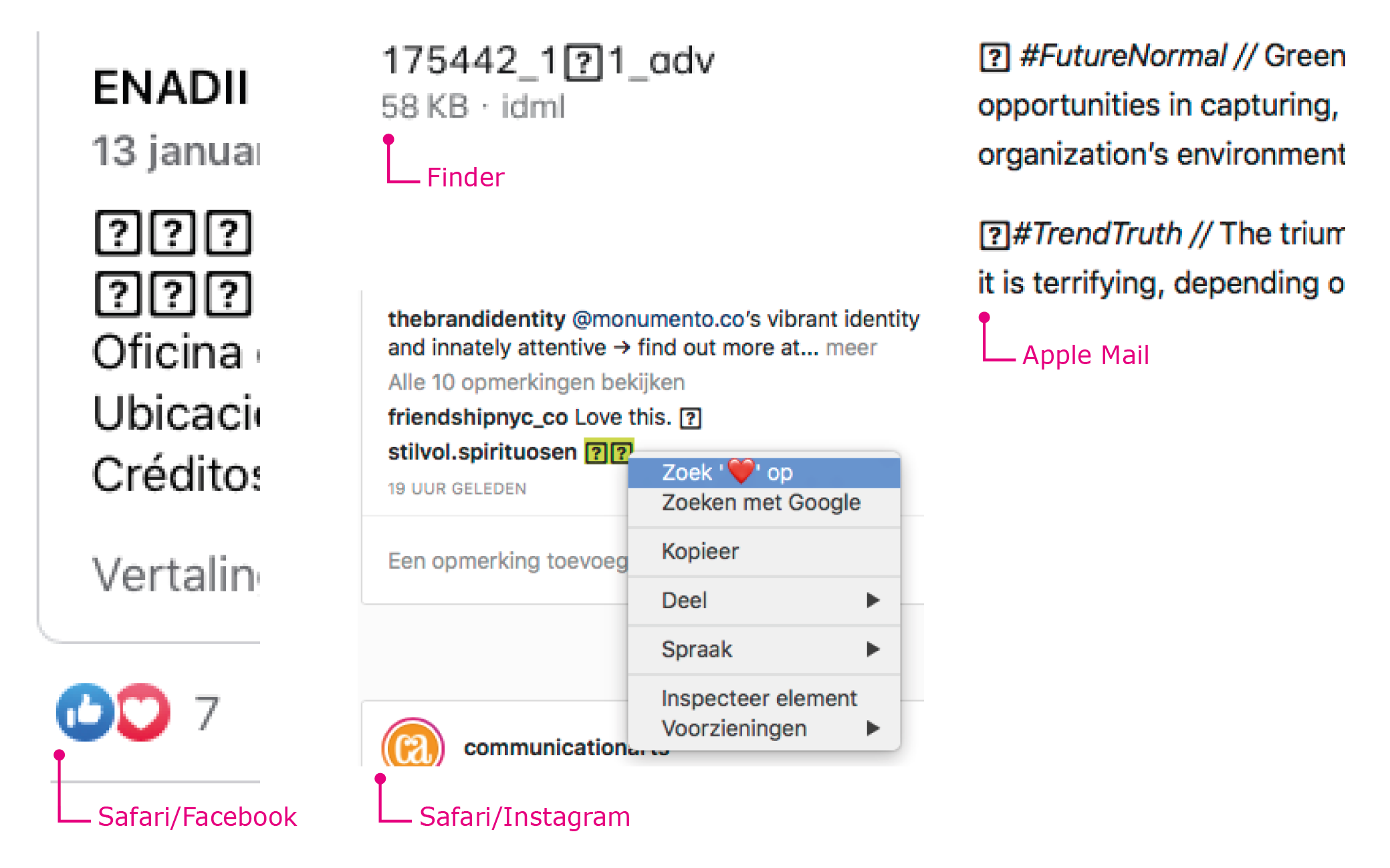 Hi, the emoji's on my Mac Pro are only partially displayed, meaning some are, some aren't. Although Apple Emoji's are activated through Fontbook (and Suitcase) I still get mixed results. Ranging from Finder to Safari and Aple MaiI. I made a few screenshots to look at. And there's an EtreCheck. Any ideas? TIA!