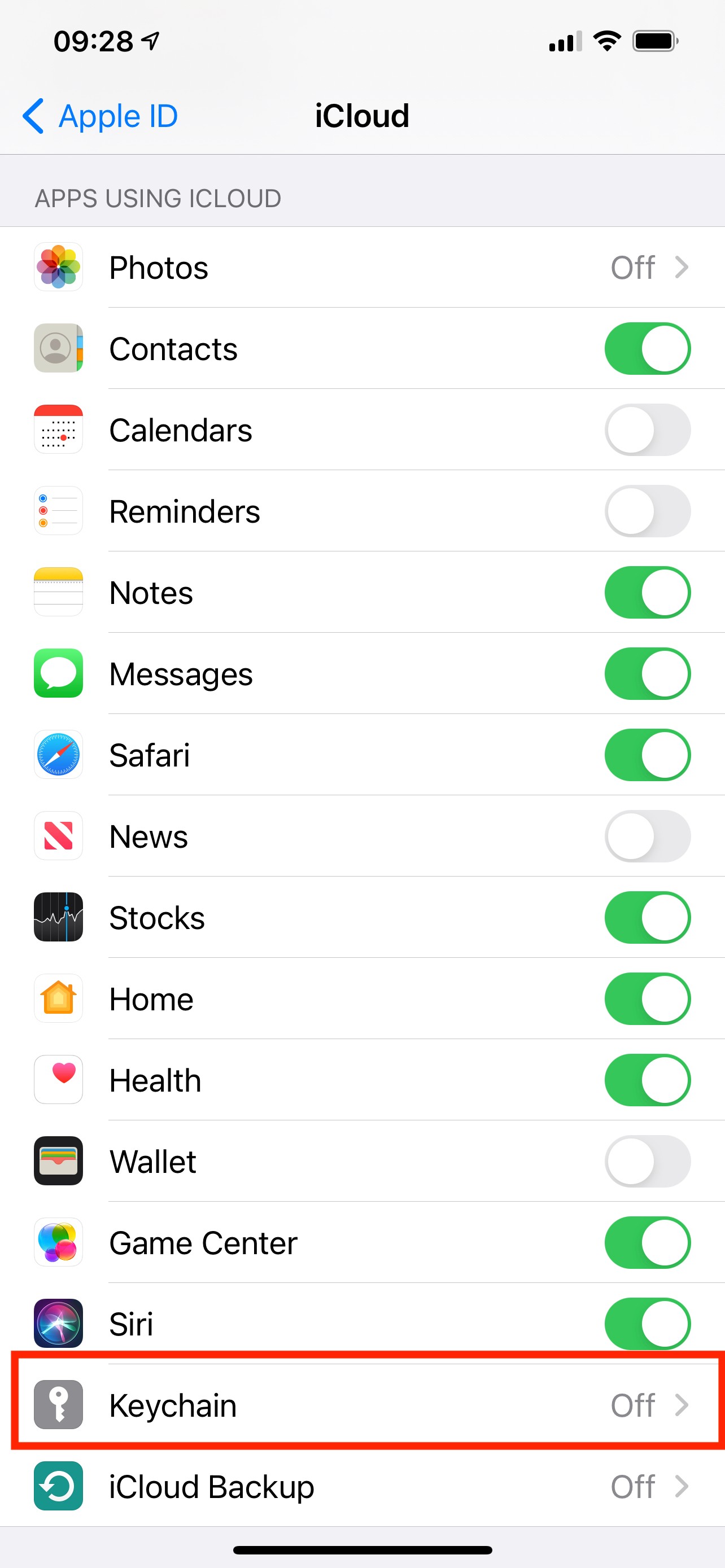 Tap Settings. Tap your name at the top. Tap iCloud. Turn off the switch for Keychain. What happens next?
