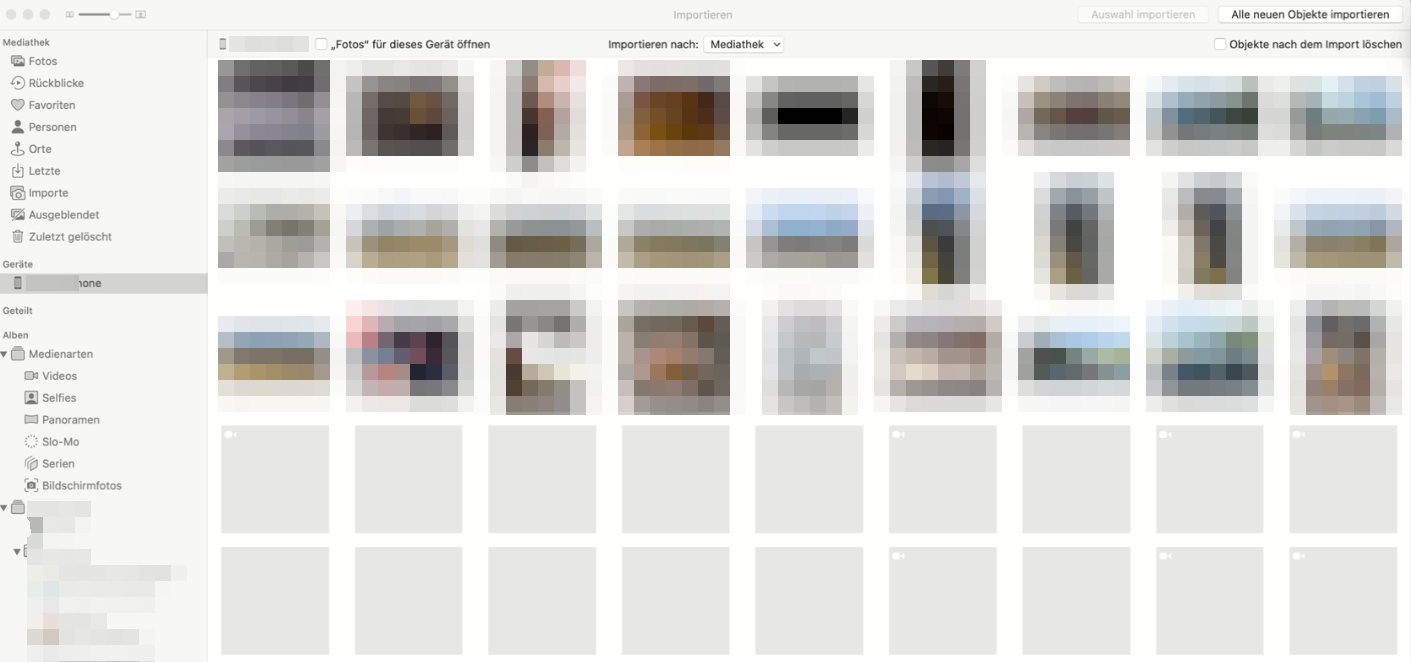 If we select Devices (Geräte) => myname Iphone it loads some thumbnails but then stops and only displays gray squares.