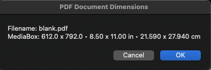 display dialog "Filename: " & fname & return & "MediaBox: " & Wm & " x " & Hm & MB_fmt_inches & MB_fmt_metric with title "PDF Document Dimensions"