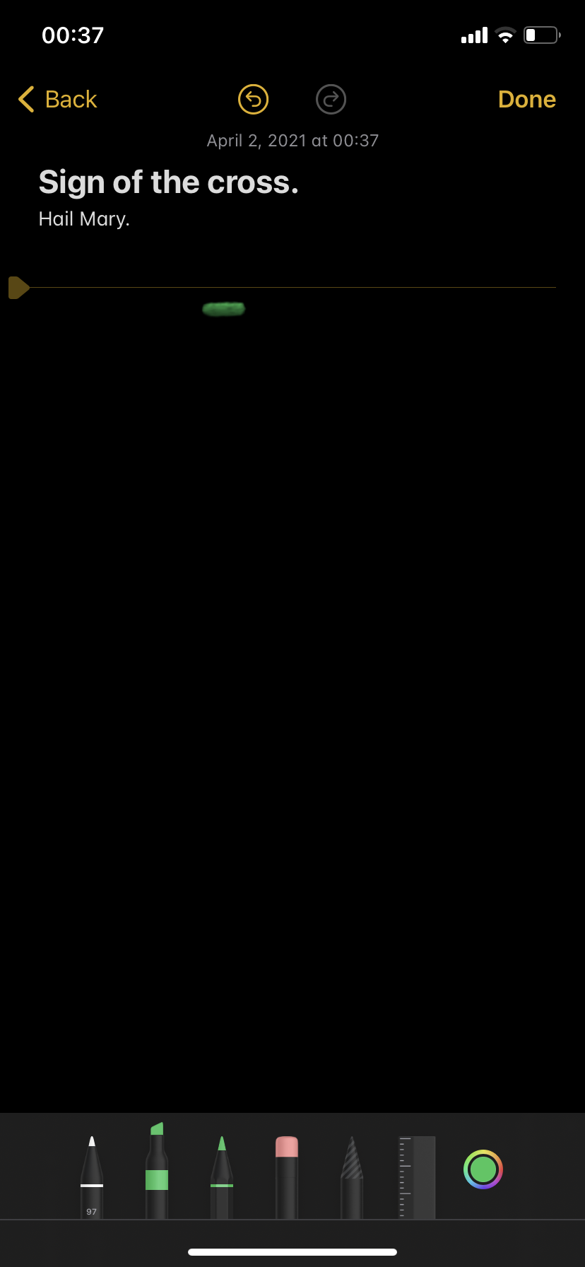 I copied some text off of the browser. I pasted it on the Notes app. Now, I want to highlight some of the words there with the color green. You know that pen you use to highlight words on your book when you want to immediately come off of the page? That’s the one I’m trying to do. So I keep on trying to press that and it won’t highlight for me. Attached is what is just allowing me when I want to use it. It won’t highlight what I wanted to highlight. Even if I just go ahead and type in some words as shown below. Notice the line that comes up with the arrowhead ➡️. I can’t go above it to swipe the words. I can’t put it on top of the words either.