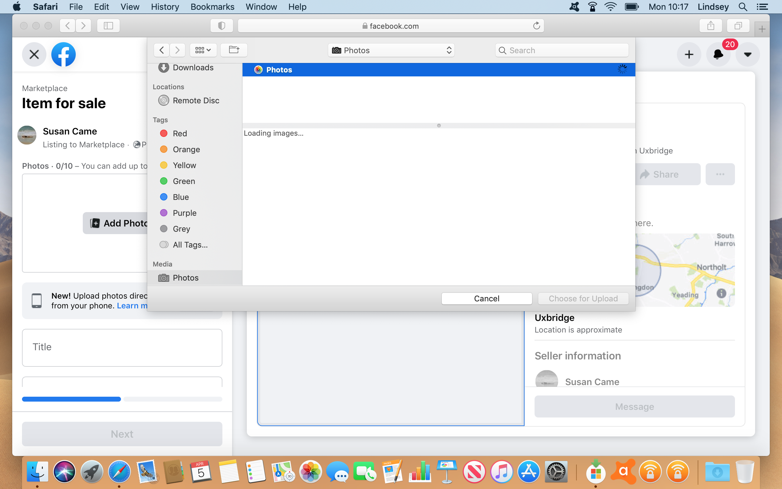 Not like that. I am trying to upload photos to facebook marketplace. I usually just click on the 'add photos' bit on the listing template in facebook and it brings up the left hand column as above. I then select 'Photos' and the right hand pane then lists my photo library and I choose the folder where I keep pictures of stuff for sale and just choose the ones I want to add to the listing. What happens now is that I select 'Photos' and the right hand pane is divided horizontally - the top bit just has the word Photos with no albums listed below it and the lower part of the pane says 'Open Photos to see your photos in this list'. The 'choose for upload' button is greyed out. I can't find a way to open photos from this pane.