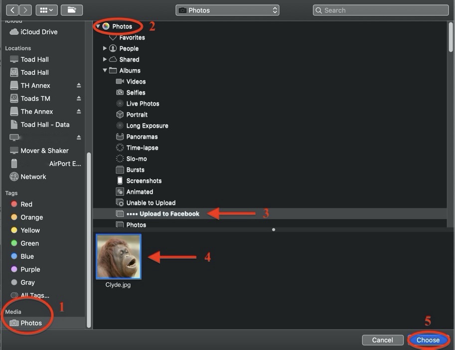>Have you tried to view the photos enlarged in Photos before you want to upload them to Facebook? Viewing them enlarged will force a download to the Mac, so the Media Browser can show them.