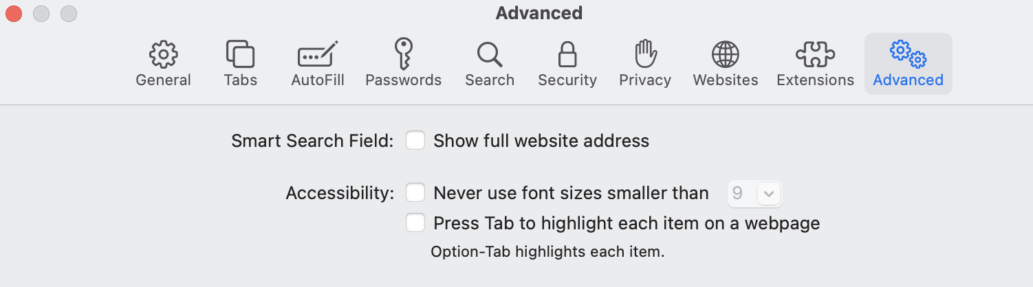 I am unable to locate in iMac Safari Preferences where I can bump up the readability of Safari tool bars, history, bookmarks, tabs, location bar etc. Please point me in the right direction where these attributes can be adjusted.