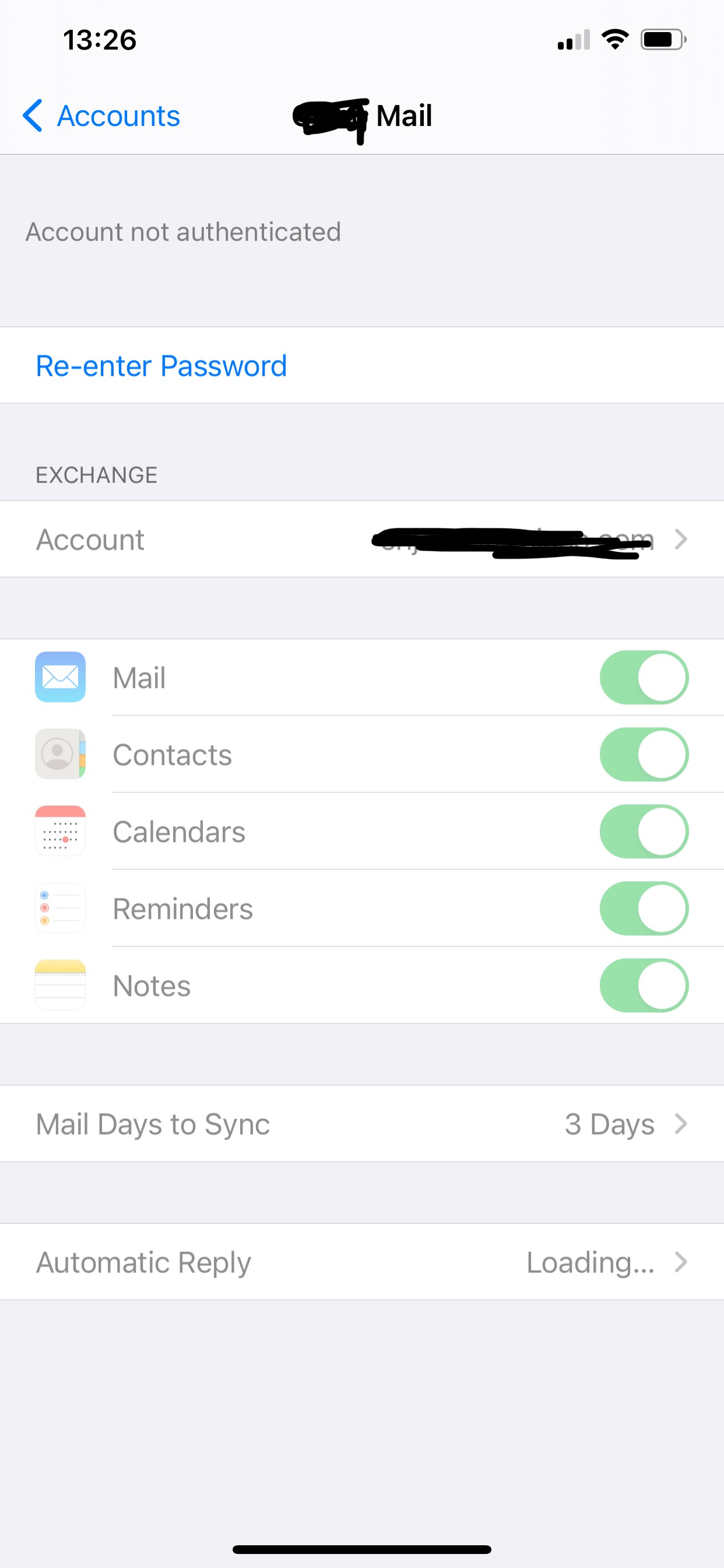 However, I am now no longer able to remove the email account from my iPhone Mail app / accounts - as a password needs to be used (Account not authenticated) before I have the option to disable mail (or contacts etc) as everything is greyed out.