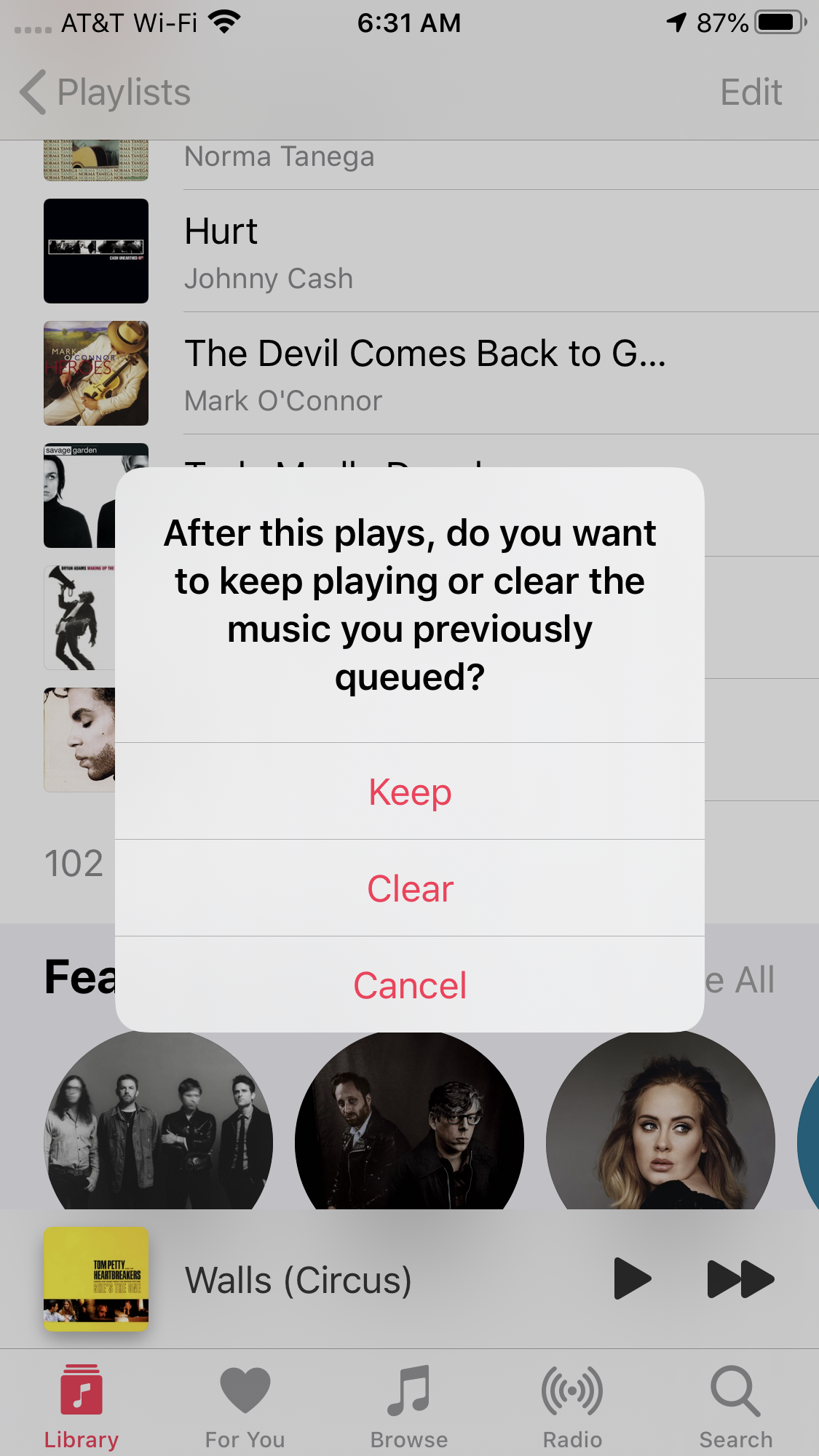 So I then quit Apple Music and reopened it, chose a completely different album and genre and was prompt with this message “After this plays, do you want to keep playing or clear the music you previously queued?”
