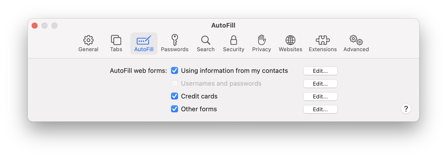 Since a couple of days ago Safari 14.0.3 on macOS 11.2.3 no longer shows me the prompt to fill in passwords in webpages, and the preferences for AutoFill show "Usernames and passwords" greyed out.
