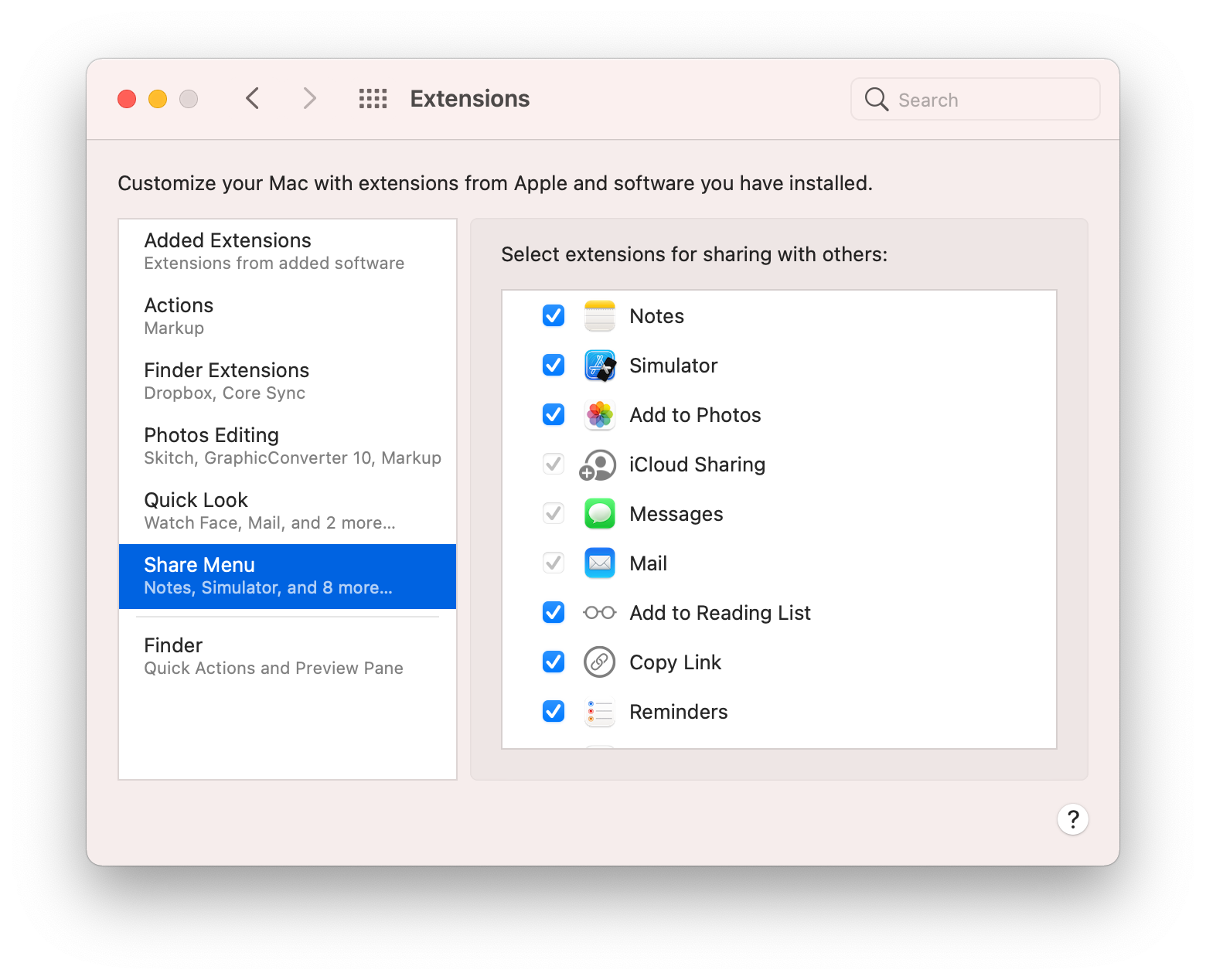 Using plutil (plutil -convert xml1), I converted com.apple.preferences.extensions.ShareMenu.plist to a text-based plist and confirmed the contents looked sensible.