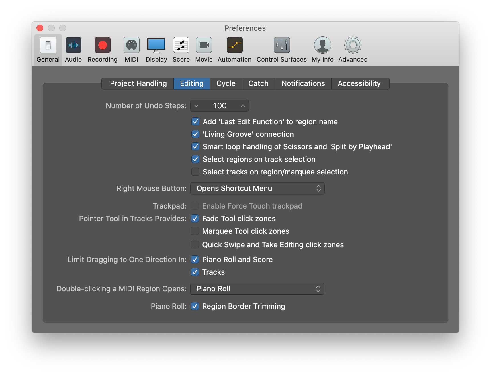 I have researched this and was unable to find a supported key-cmd for this oft-used function. "Select all" (cmd-A) is supported, of course, but then using the Piano Roll and editing one particular track of one region and I use cmd-A, then ALL the notes of the track are selected; I only want to be able to select all the notes of the particular region which I am currently editing. I realize that I could drag the pointer to select a handful of notes. But I might miss some notes without shrinking the size of the window. It seems intuitive that I should be able to select ONLY the notes of one region that I am editing WITHOUT automatically selecting ALL the notes of the entire track. I would like to request that this function be supported. Thank you.